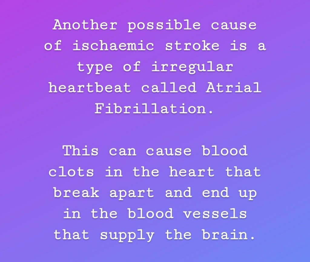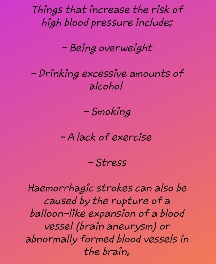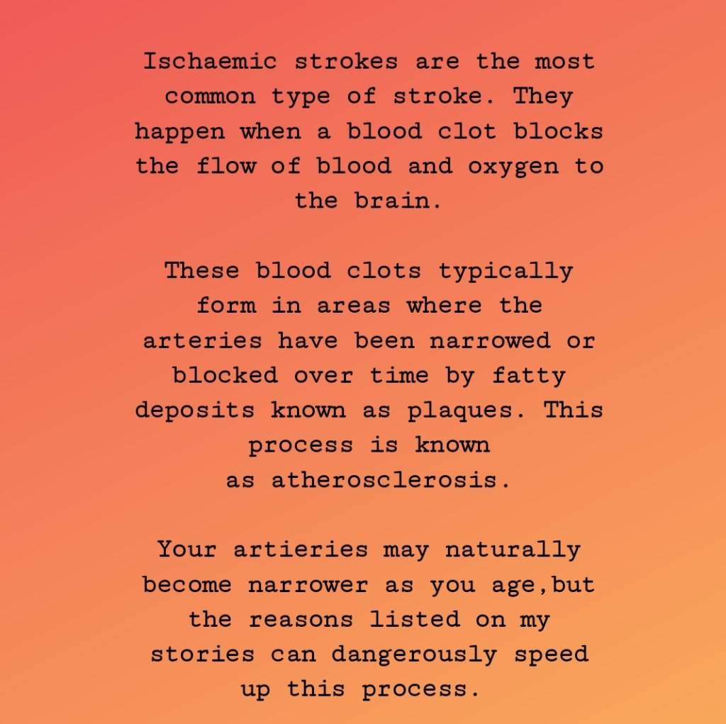 Stroke can happen AT ANY AGE to ANYONE. It is not just people over 60 years old who suffer with them and it is possible to have a stroke with no underlying issues to cause them. (Read the last sentence again).